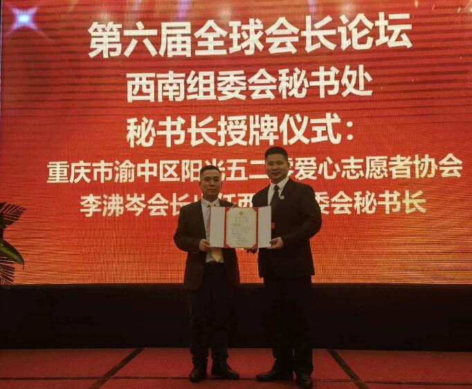 中国联合通讯社联盟中央社新闻联播:热烈祝贺海峡两岸人民至上爱国统一志愿者联盟宣传部西南之行!热烈祝贺第六届全球会长论坛西南组委会筹备会议胜利召开,重庆市渝中区阳光五二零爱心志愿者协会李沸岑会长出任西南组委会秘书长,浙江省印花行业协会会长、金华市工商联执委、全球会长论坛组委会创始人、詹红伟秘书长为李沸岑会长完成授牌仪式;