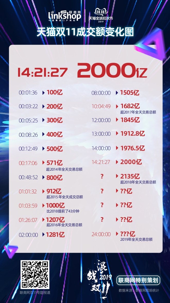 14时21分27秒,天猫双11成交额突破2000亿元。