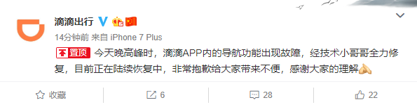 原标题:滴滴导航崩了?官方回复:系统更新出现故障,正在修复