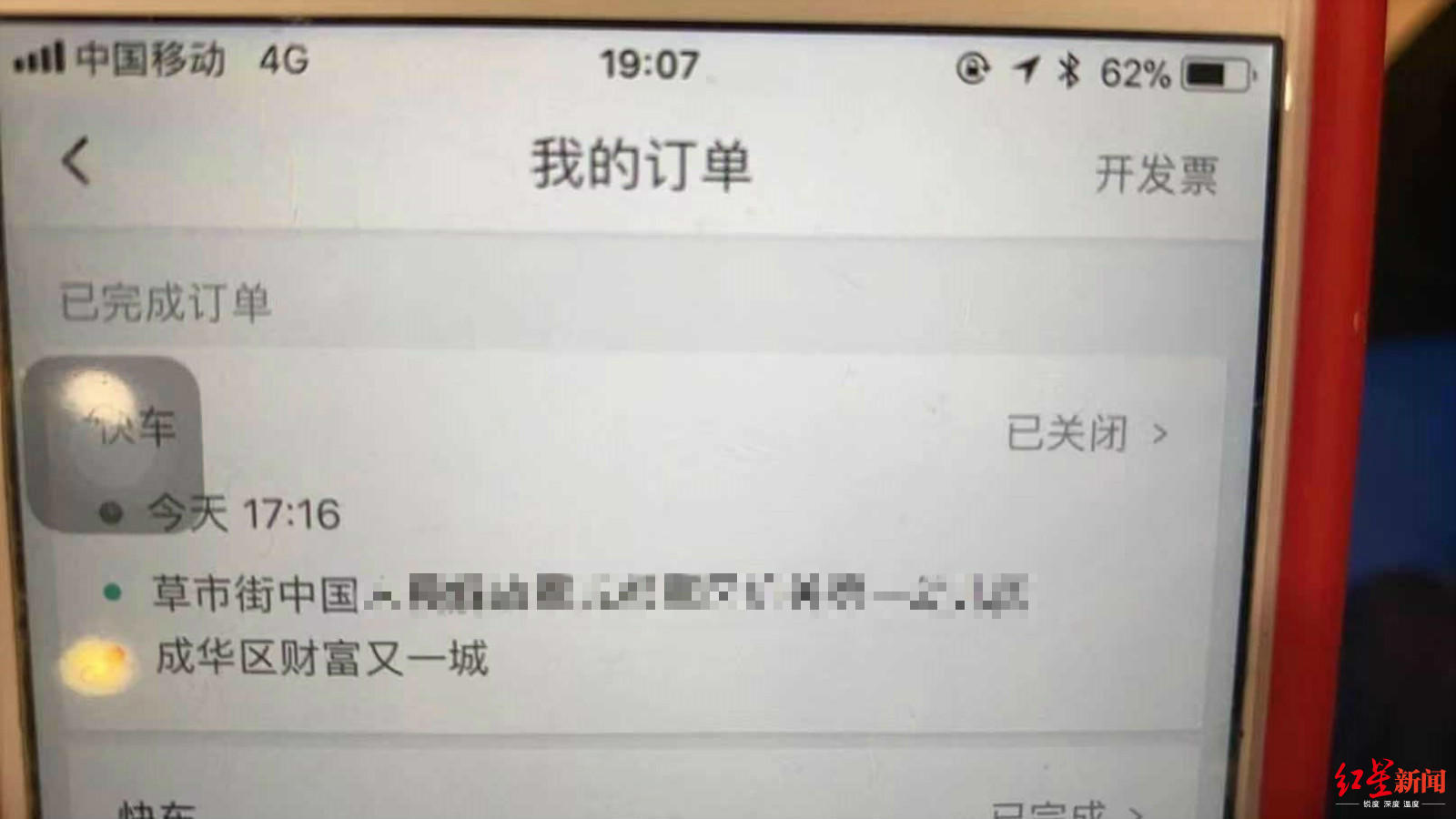成都市民袁女士告诉红星新闻记者,今天下午五点十多分的时候,她打滴滴快车计划从成都市东珠市街到财富又一城。袁女士下单后就显示有司机接单。袁女士发现,司机接了单之后,能看得到车在动,但是在离上车点约两公里的时候,接单司机打来电话,说平台导航系统出问题了,他看不到他的目的地在哪儿,然后说他过不来了。