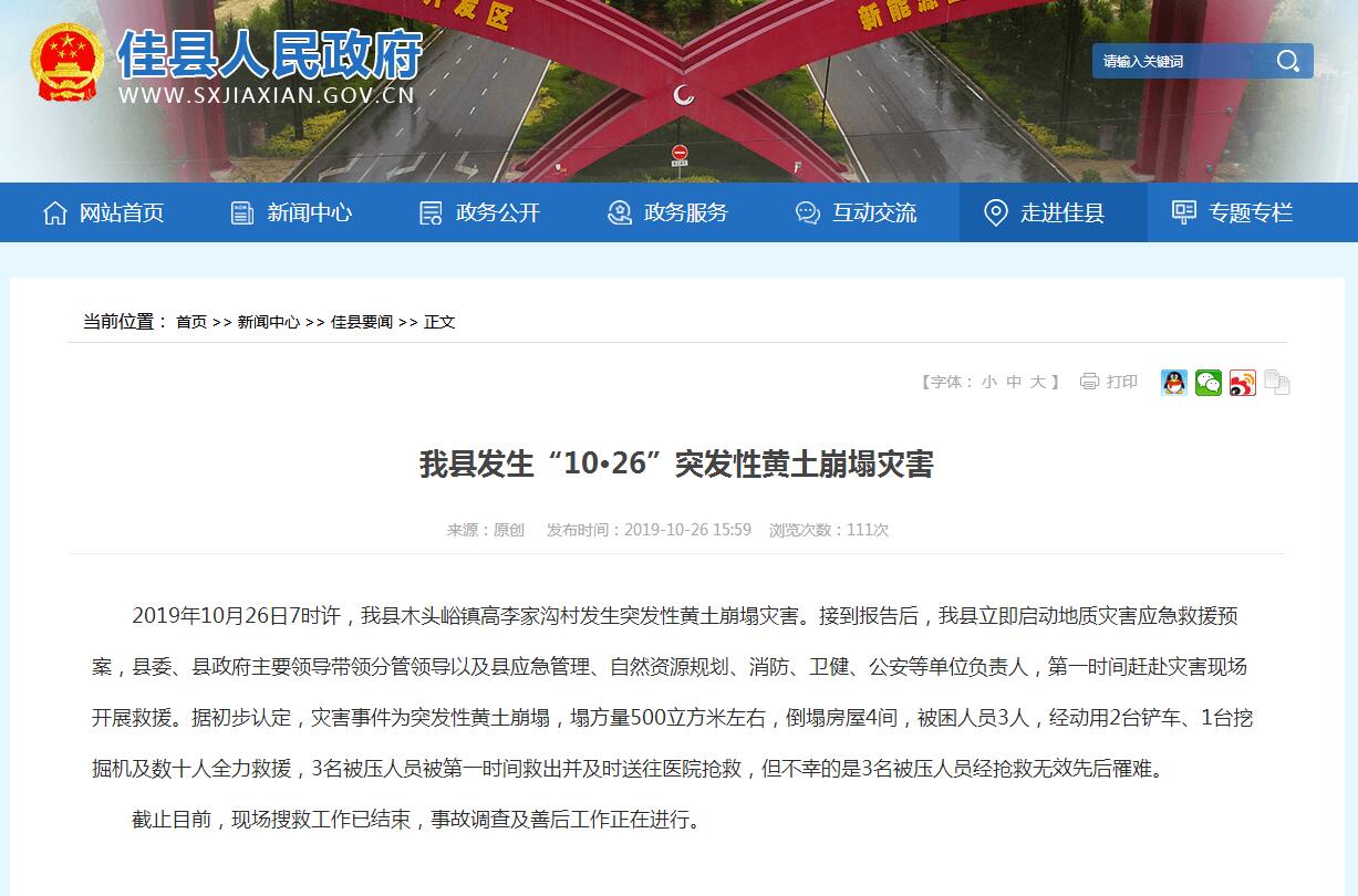 据陕西省榆林市佳县人民政府网站消息,10月26日7时许,佳县木头峪镇高李家沟村发生突发性黄土崩塌灾害,3名被压人员经抢救无效先后罹难。